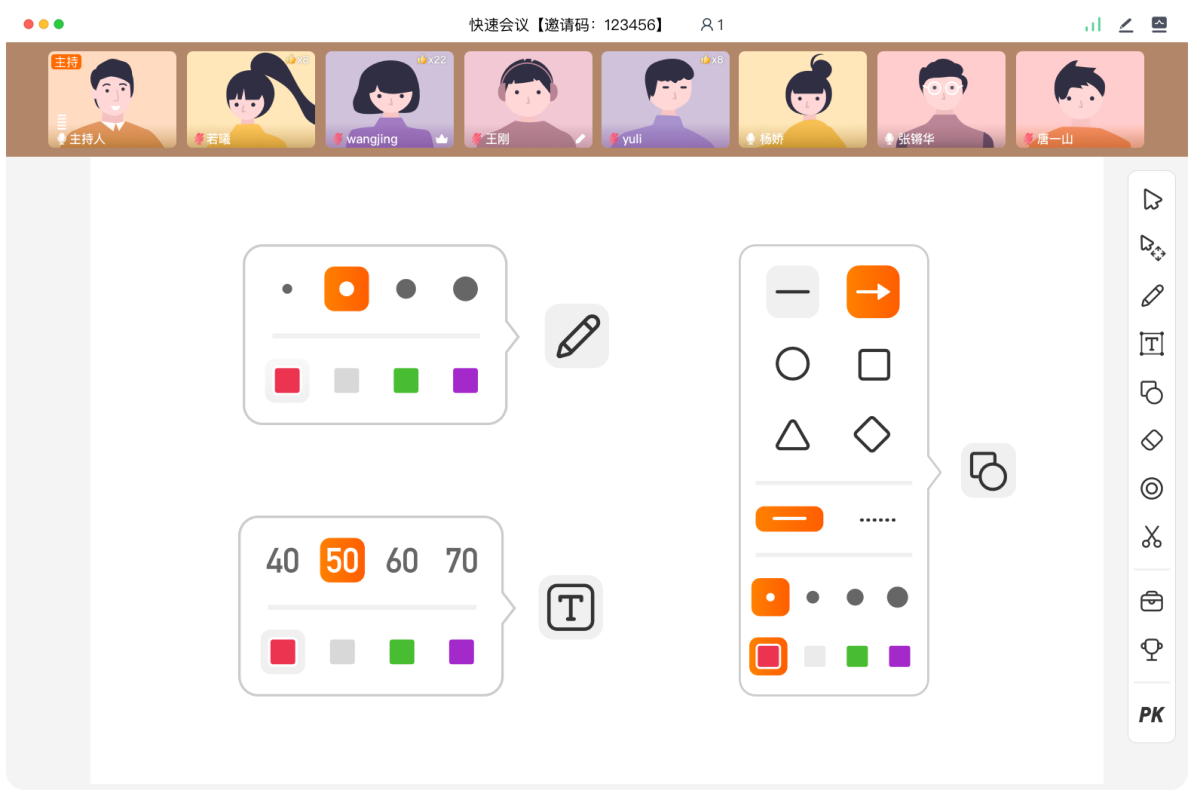 支持激光笔、画笔、文字、图形等多种工具,辅助演示